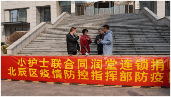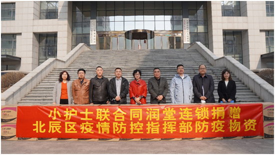 3月10日上午,捐贈儀式在北辰區政府舉行,出席儀式的有北辰區副區長馬希榮、區防疫工作指揮部組長竇百鳴、區防疫工作指揮部辦公室主任楊肖鴻、小護士公司董事長楊印江、同潤堂連鎖總經理楊懷亮、小護士公司董事會秘書董曉光、小護士公司人資行政總監方立勝。
